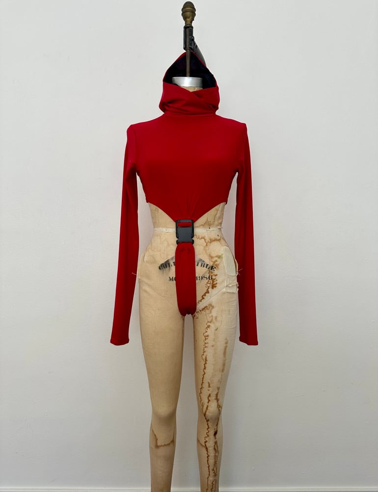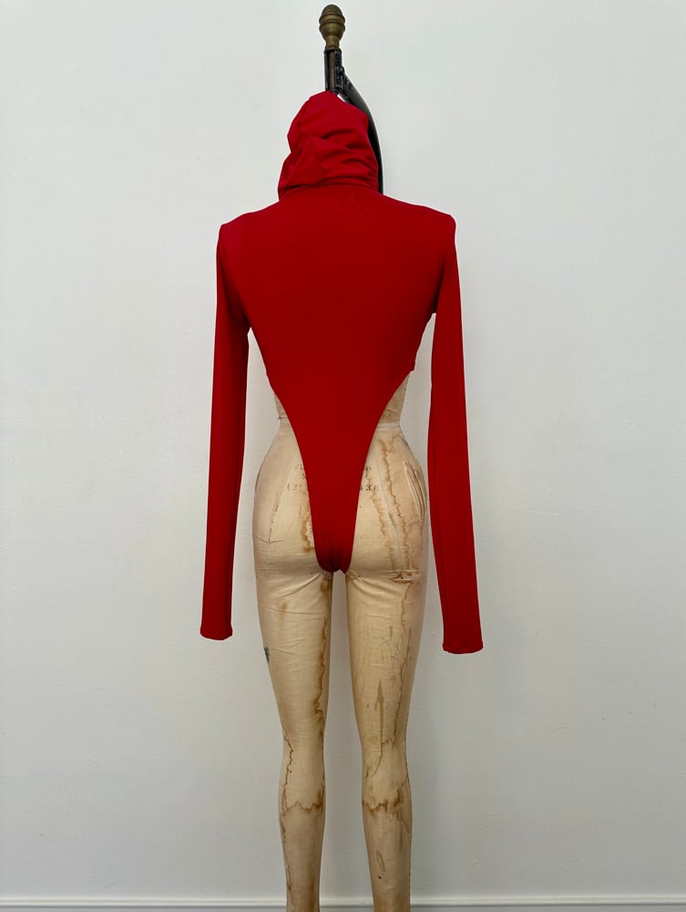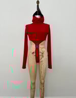 Red spandex bodysuit w/ poly sports mesh lined hood.